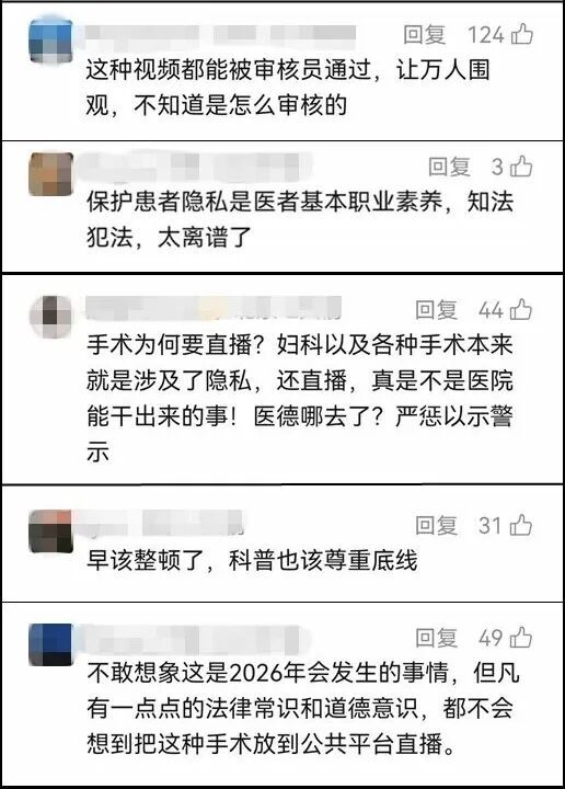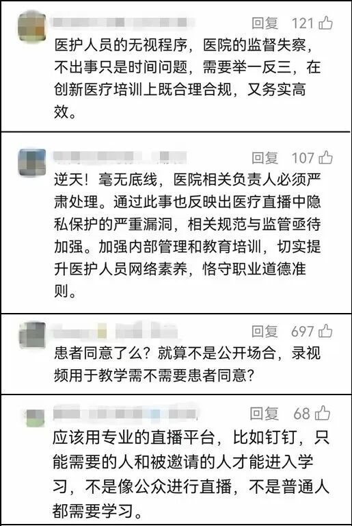 对此,网友们普遍对此表示质疑,“录视频用于教学需不需要患者同意?”“毫无底线,医院相关负责人必须严肃处理。”“应该用专业的直播平台。”