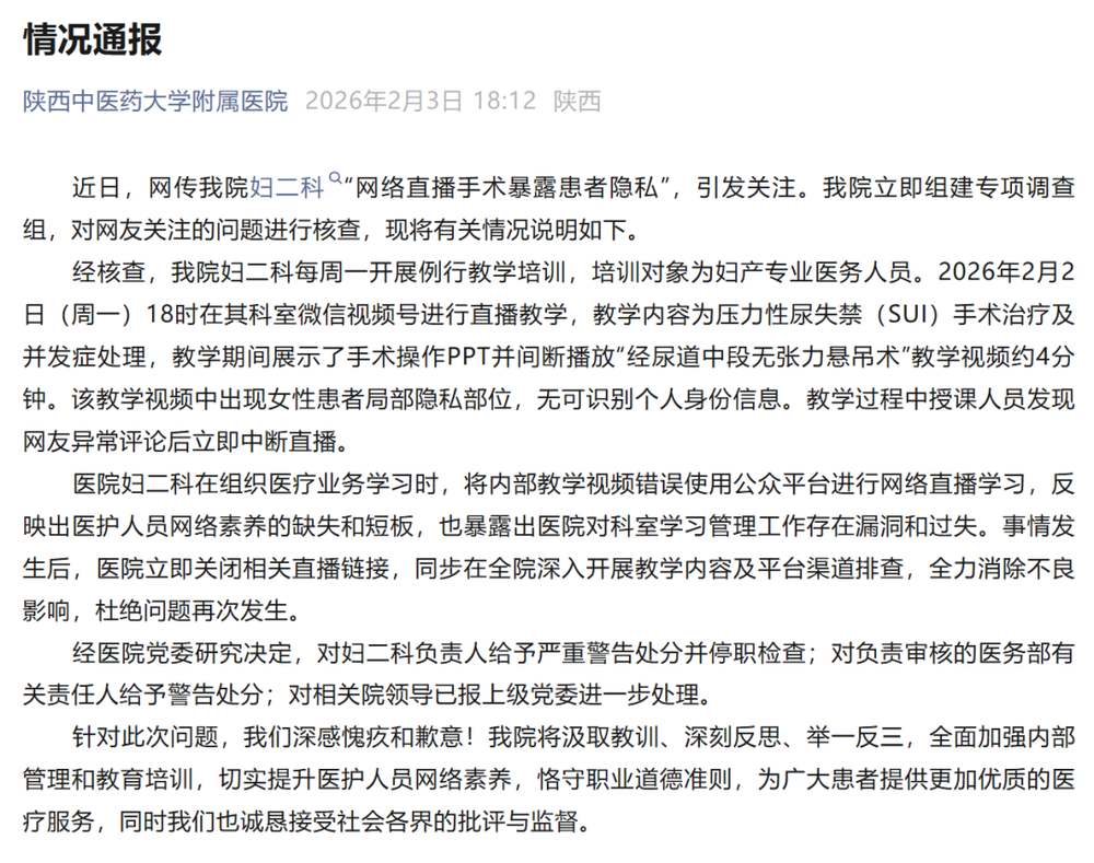 近日,陕西中医药大学附属医院妇二科在网络平台直播做手术,画面中直接出现女性患者隐私部位,被多名网友举报。网友质疑女患者是否知情,即便知情,这样的画面也不宜公开直播。